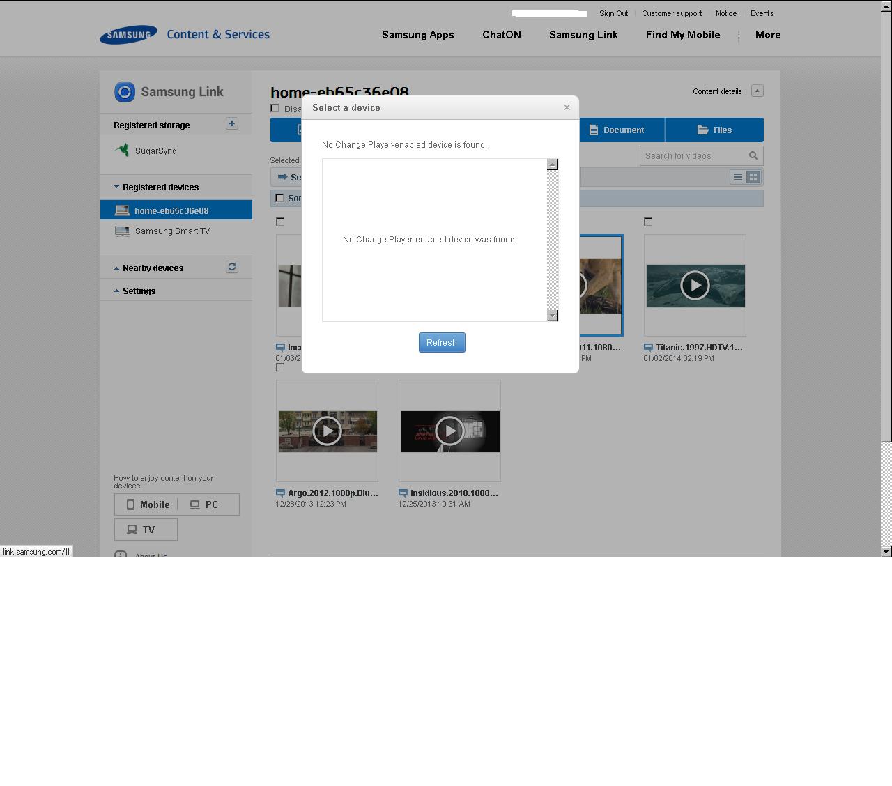 Cand intru in Samsung Link/Videos si vreau sa dau change player imi spune: No Change player device-enabled is found.