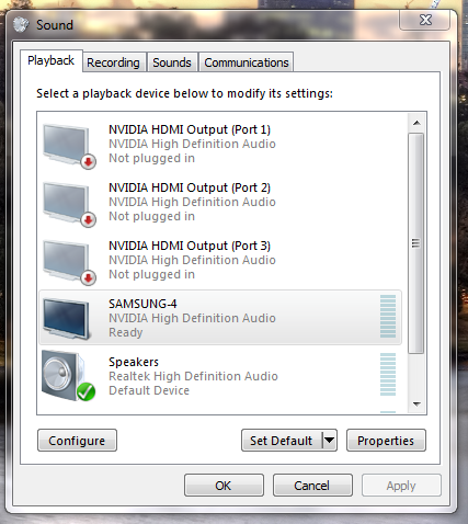 La mine e foarte simplu...click dreapta pe difuzorul din bara...aleg playback devices si daca e setat pe speakers sunetul se aude la "PC" daca e setat SAMSUNG-4 sunetul se va auzi in tv...